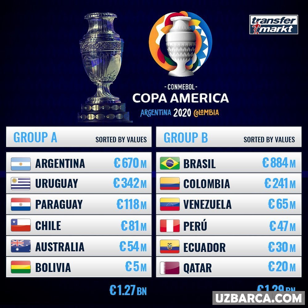Transfermarkt. Copa America-2020 turniri guruhlaridagi eng qimmat tarkibga ega terma jamoalar