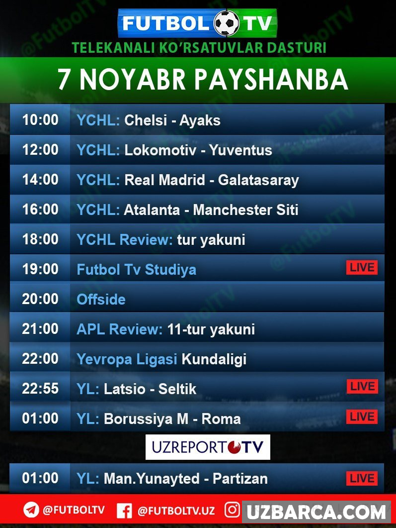 FUTBOL TV telekanalining 7-noyabr kunidagi ko'rsatuvlar dasturi