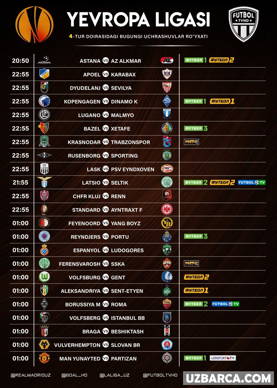 Yevropa Ligasining bugungi uchrashuvlar ro'yxati va ularni translyatsiya qiladigan telekanallar! Barcha o'yinlar (Tshv) bilan ko'rsatilgan!