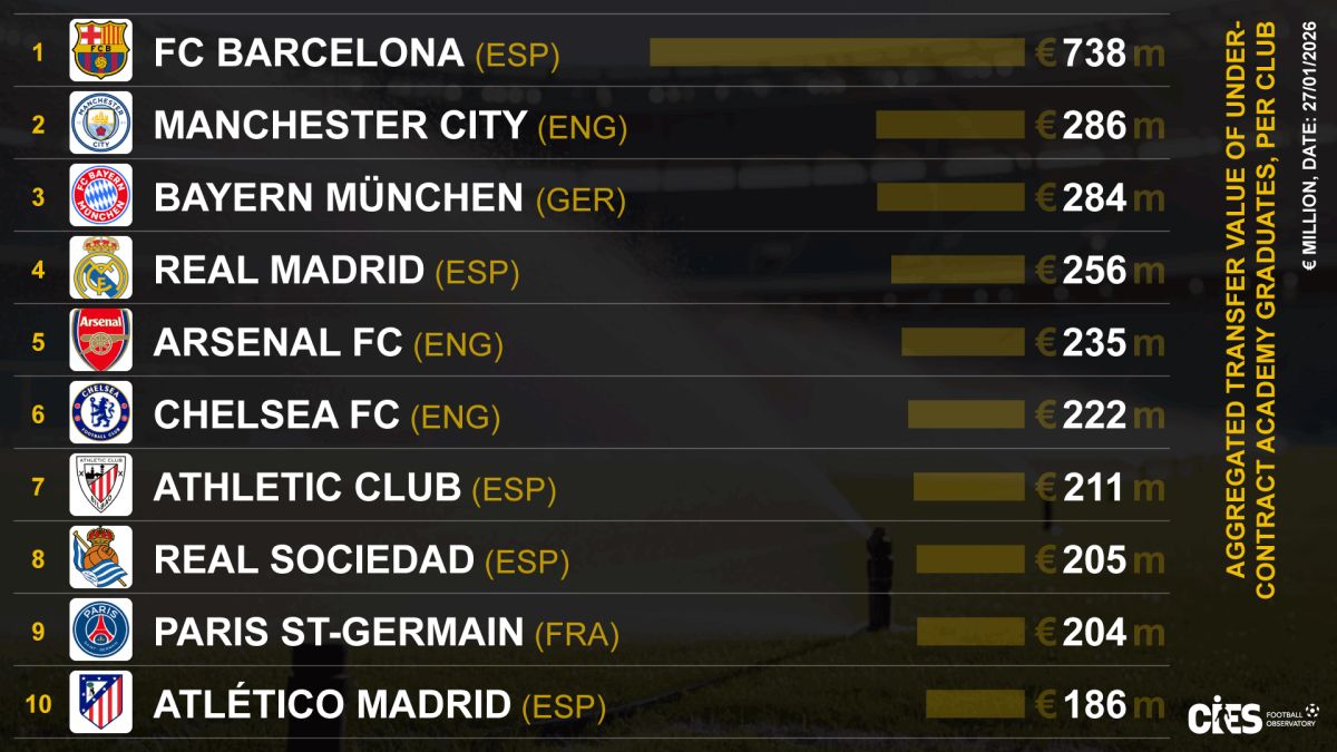 Bu ko'rsatkich dunyodagi barcha futbol klublari orasida eng yuqori hisoblanadi. "La Masiya" bitiruvchilari orasida eng qimmat futbolchi sifatida vinger Lamin Yamal ajralib turibdi — u 335 mln evroga baholangan.
