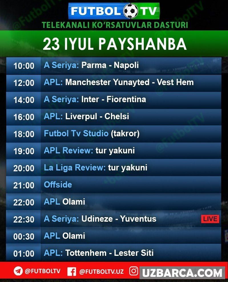 FUTBOL TV telekanalining 23-iyul kunidagi ko'rsatuvlar dasturi