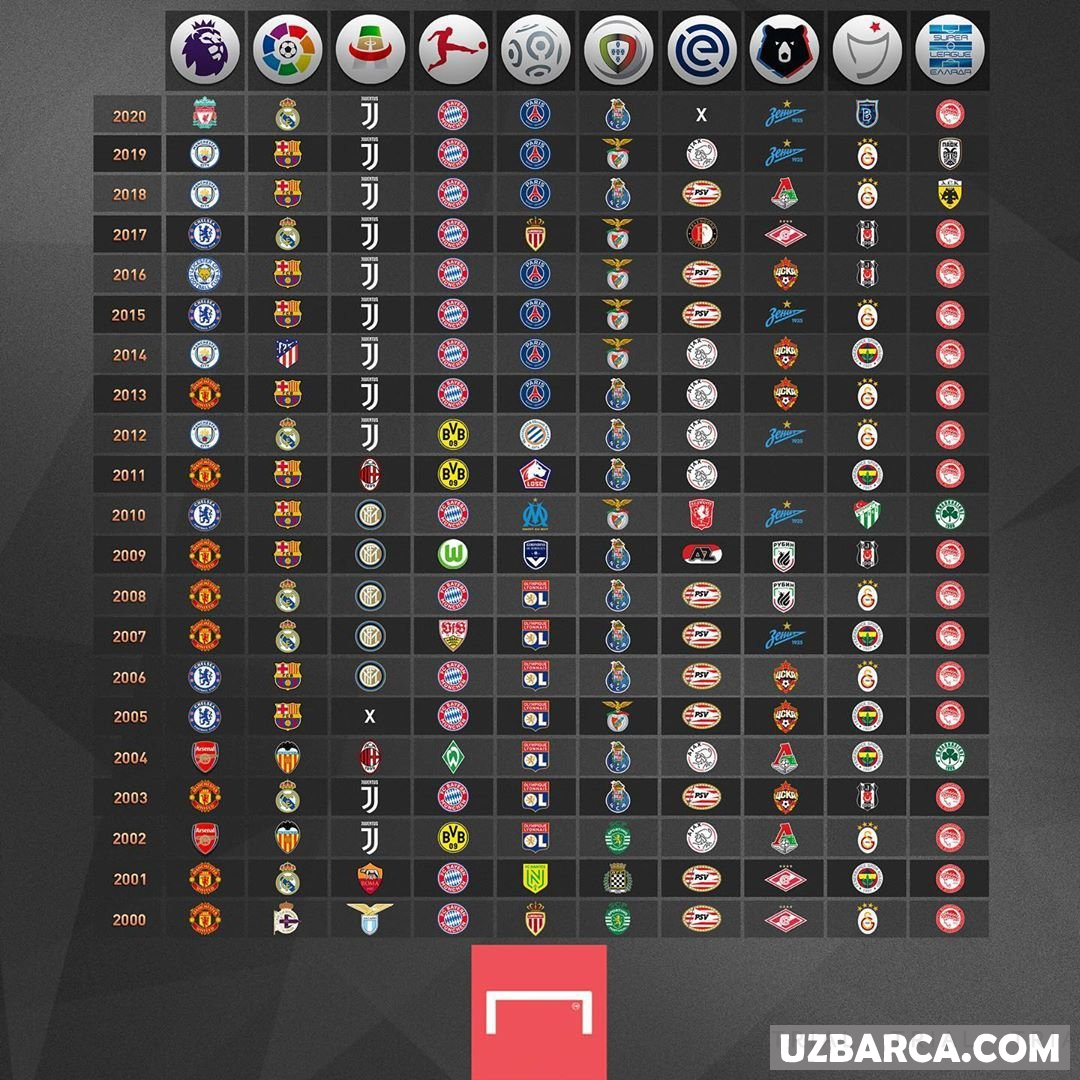 Top chempionatlardagi 21 yil davomida barcha chempionlar