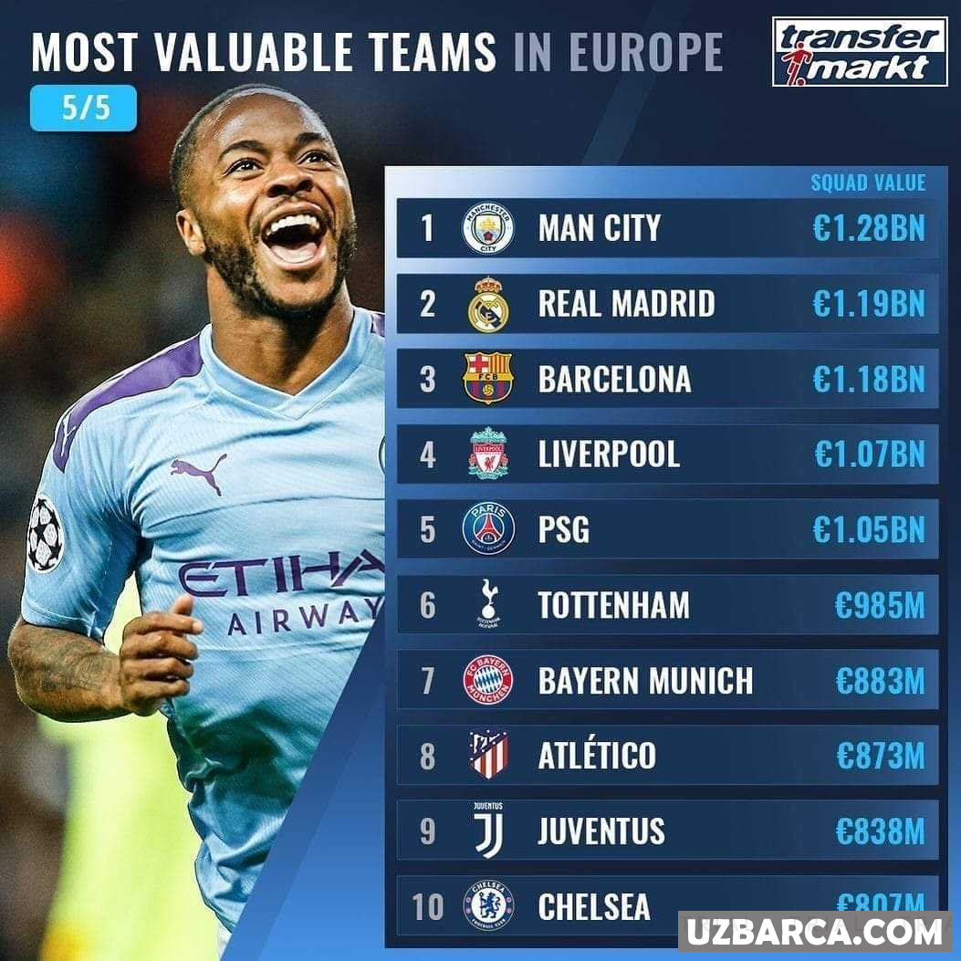 Transfer Market talqini böyicha hozirgi kundagi Yevropadagi eng qimmat jamoalar