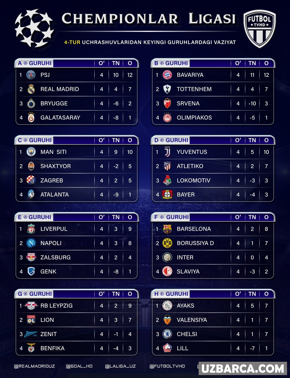 Chempionlar Ligasi 4-turidan so'ng guruhlardagi vaziyat bilan tanishing.