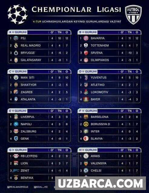 Gurux bosqich 4 - tur uchrashuvlari natijalaridan keyin guruxlardagi vaziyatlar bilan tanishing!
