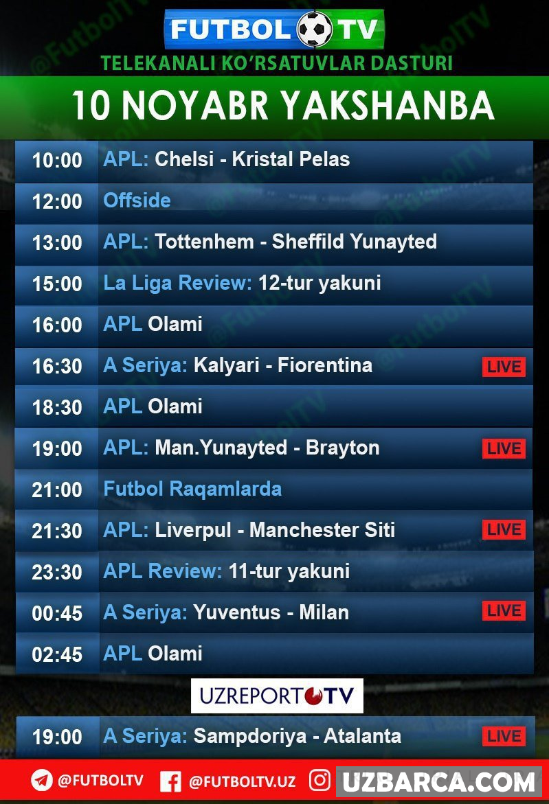 FUTBOL TV telekanalining 10-noyabr kunidagi ko'rsatuvlar dasturi
