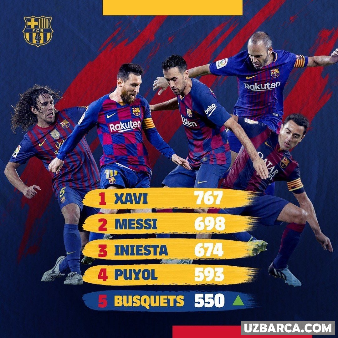 "Barselona" tarixida eng ko'p o'yin o'tkazgan futbolchilar. Buskets bu borada 5-o'ringa chiqib oldi.