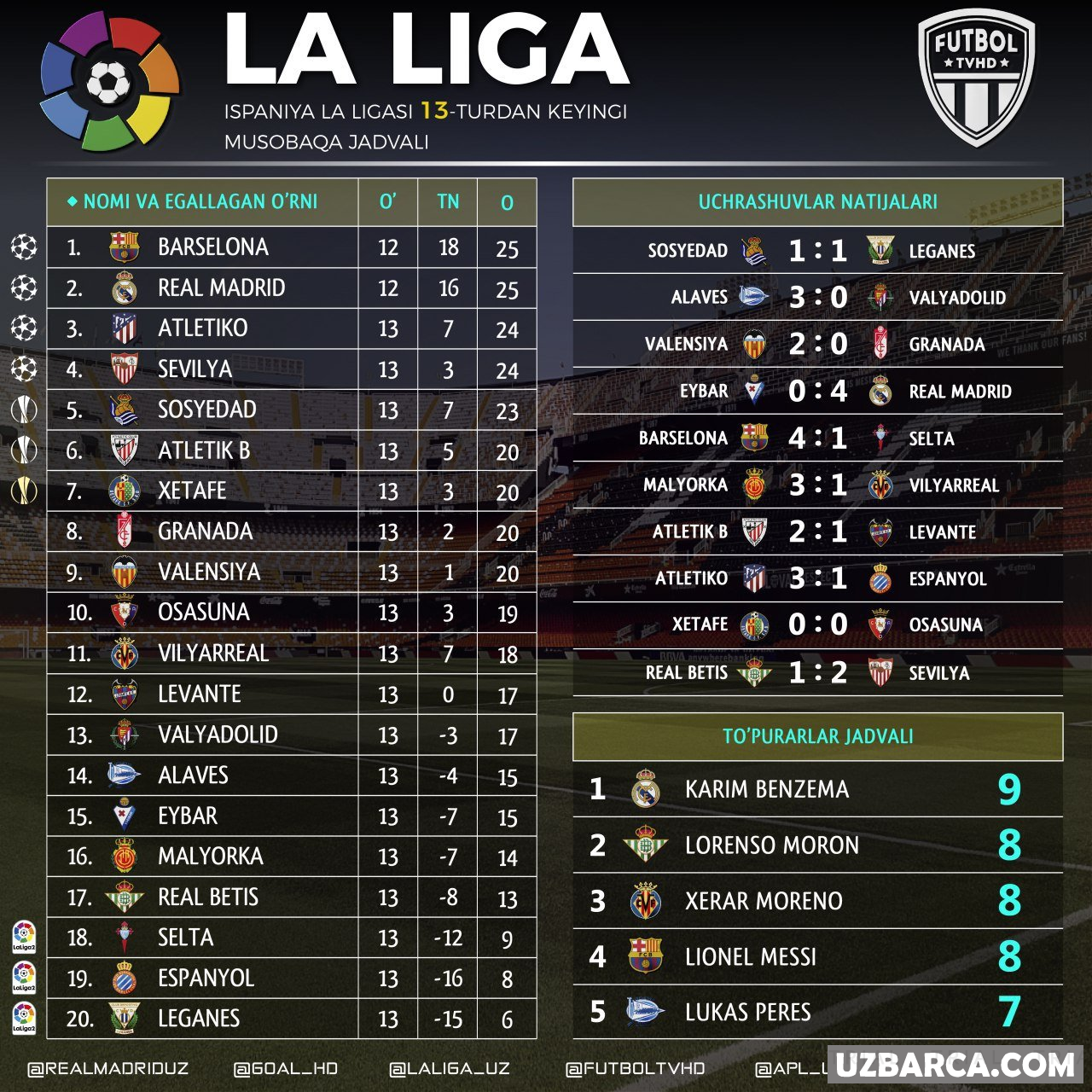 Ispaniya La Ligasining 13-tur o'yinlari natijasi, turnir jadvalidagi holat va to'purarlar ro'yxati