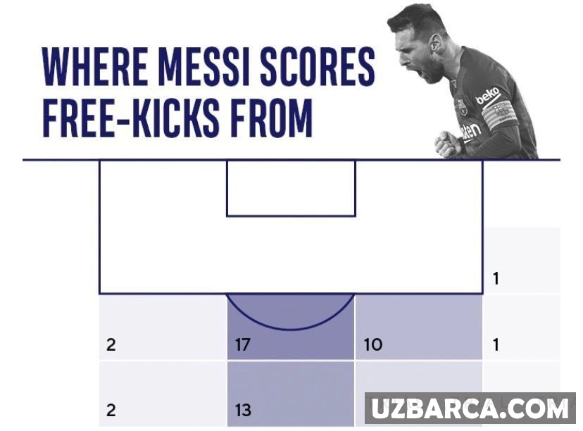 Leo Messi jarima zarbasidan urgan 52 ta golini qaysi nuqtaga yo'llagan?