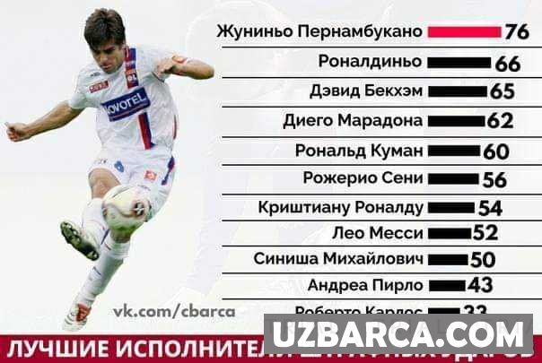 Juninho Zo'r Futbolchidi Bizga Maydon tashqarisidan ko'p gol urgan futbolchilarni top 10 taligini chiqarin