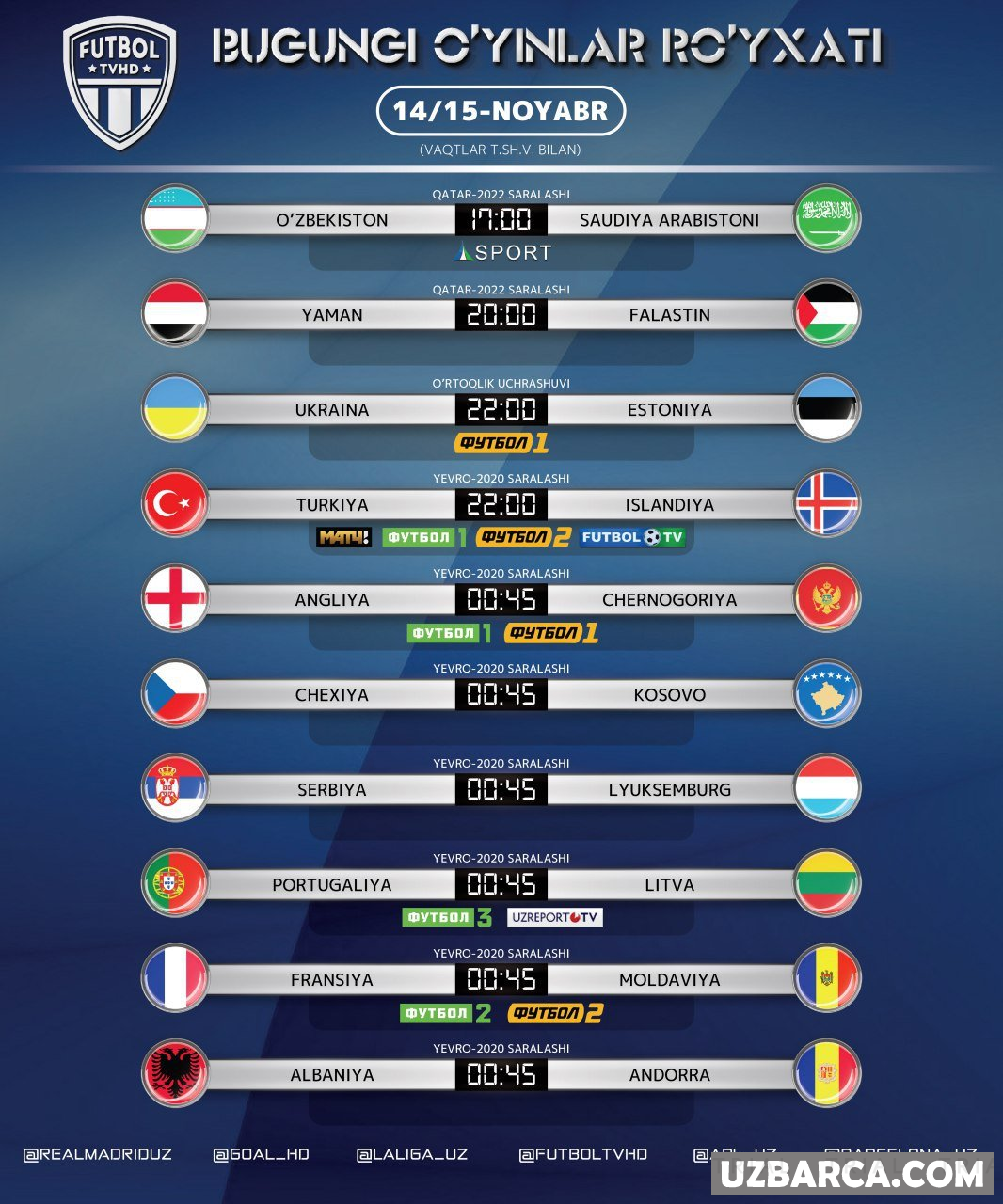 Bugungi uchrashuvlar ro'yxati va ularni translyatsiya qiladigan telekanallar! Barcha o'yinlar Tshv bilan ko'rsatilgan!