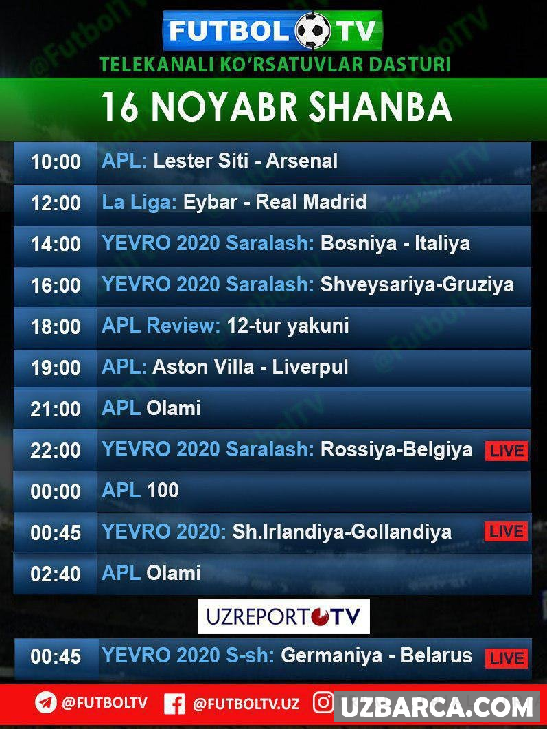 FUTBOL TV telekanalining 16-noyabr kunidagi ko'rsatuvlar dasturi