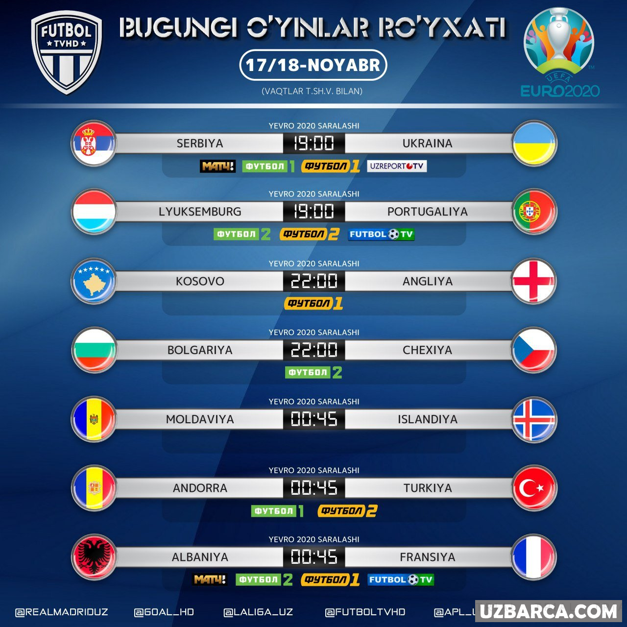 Bugungi uchrashuvlar ro'yxati va ularni translyatsiya qiladigan telekanallar! Barcha o'yinlar Tshv bilan ko'rsatilgan!