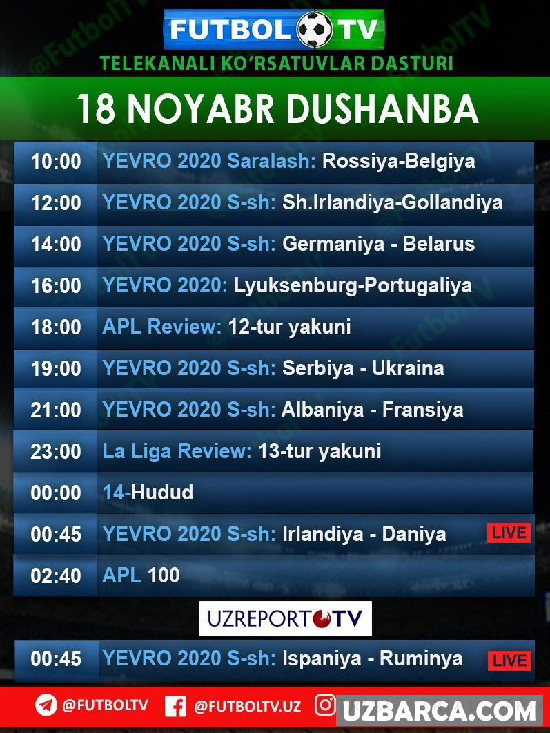 FUTBOL TV telekanalining 18-noyabr kunidagi ko'rsatuvlar dasturi