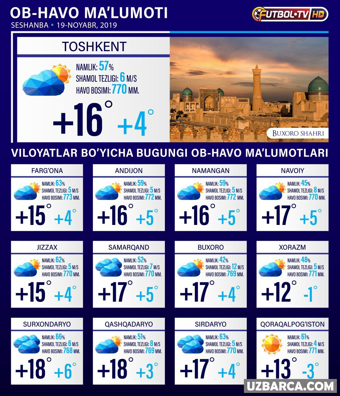 19-noyabr kunining ob-havo ma'lumotlari bilan tanishing