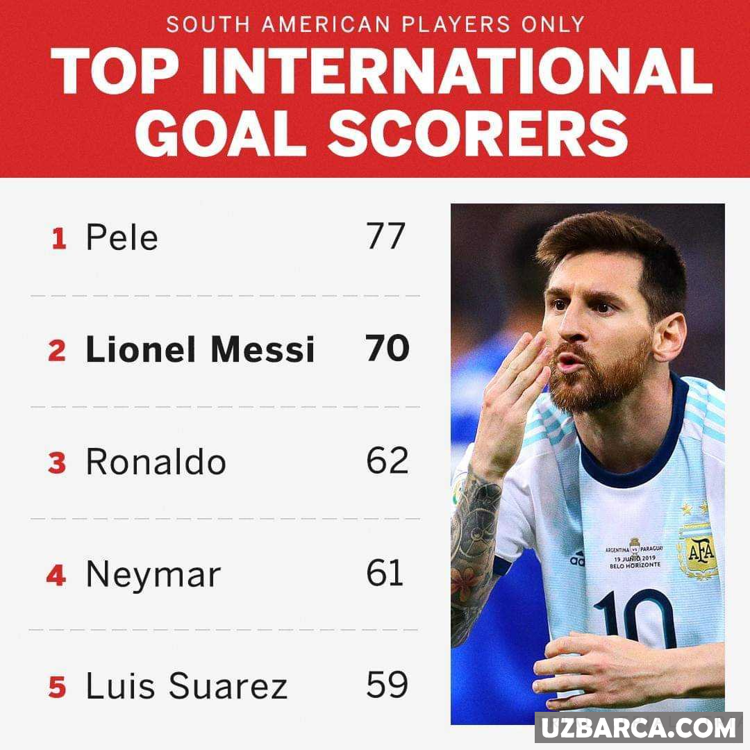 Kecha o'zining goli bilan Messi Argentina uchun 70 ta gol urdi va o'z karyerasida 70 ta gol urgan ikkinchi Janubiy Amerikalik o'yinchi bo'ldi. U 77-ga ega bo'lgan Peledan 7ta golga ortda qolmoqda.