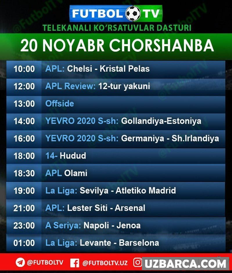 Futbol TV teletelekanali 20 noyabr kungi ko'rsatuvlar ko'rsatuvlar dasturi|20/11/2019