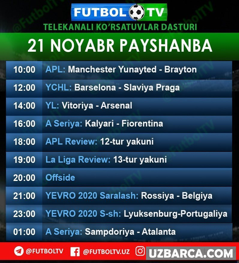 FUTBOL TV telekanalining 21-noyabr kunidagi ko'rsatuvlar dasturi