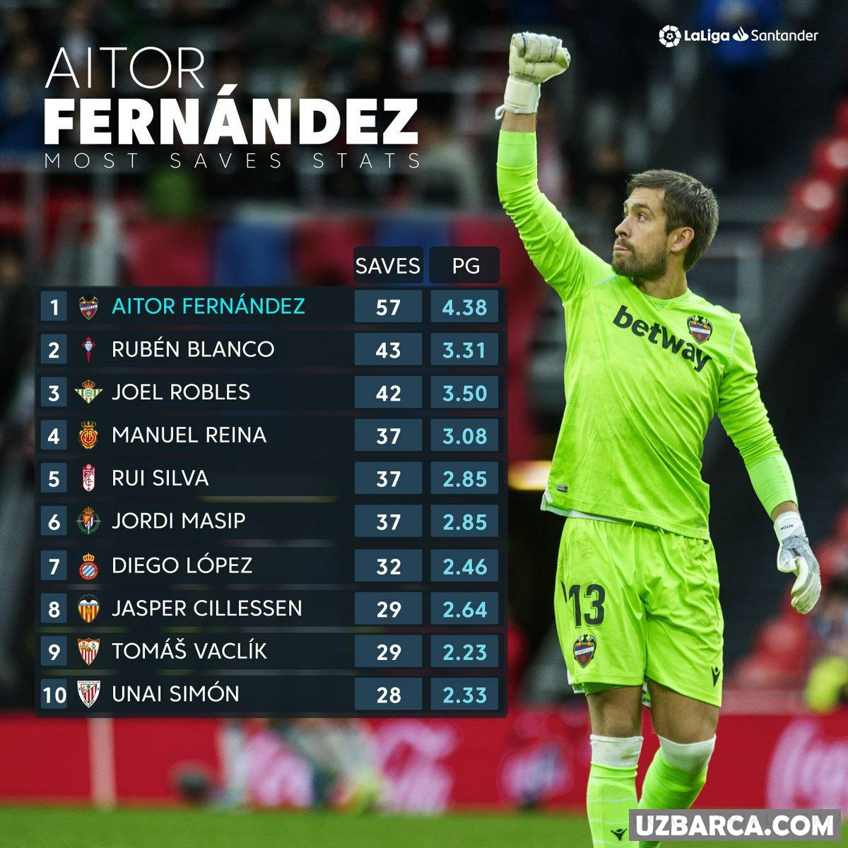 Laliga. Bu mavsum eng ko'p seyv qilgan darvozabonlar