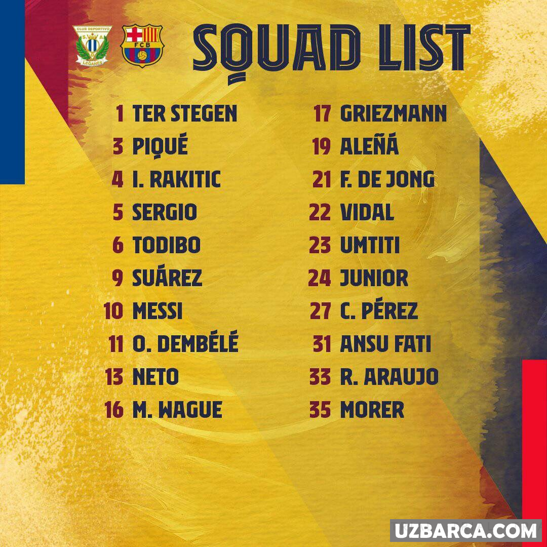 "Barselona" klubi murabbiylar shtabi Ispaniya La ligasining 14-turi doirasida bo'lib o'tadigan "Leganes"ga qarshi o'yin uchun kengaytirilgan tarkibni e'lon qildi.Serji Roberto va Artur qaydnomadan o'rin olishmadi. Darvozabonlar: Mark-Andre ter Stegen, Neto;Himoyachilar: Jerar Pike, Jan-Kler Todibo, Mussa Vage, Samuel Umtiti, Xunior Firpo, Ronald Arauxo, Dani Morer;Yarim himoyachilar: Serji Buskets, Ivan Rakitich, Usmon Dembele, Karles Alenya, Frenki de Yong, Arturo Vidal, Karles Peres, Anssuman Fati;Hujumchilar: Luis Suares, Lionel Messi, Antuan Grizmann.Eslatib o'tamiz, "Barselona" — "Leganes" o'yini 23 noyabr kuni Toshkent vaqti bilan 17:00da boshlanadi.