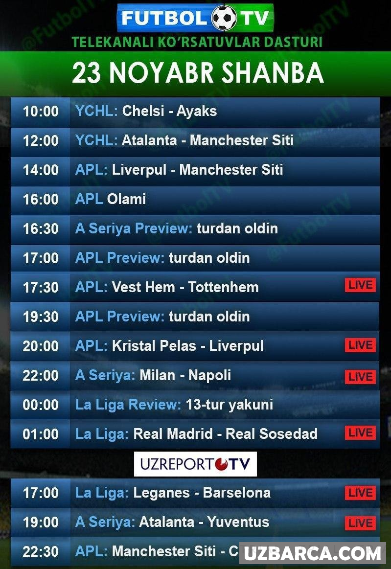 FUTBOL TV telekanalining 23-noyabr kunidagi ko'rsatuvlar dasturi
