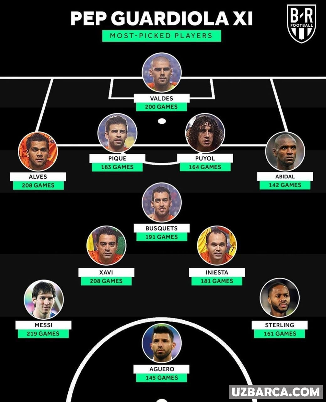 Pep Guardiola qo'l ostida eng ko'p o'yin o'tkazgan futbolchilardan tuzilgan ramziy terma jamoa