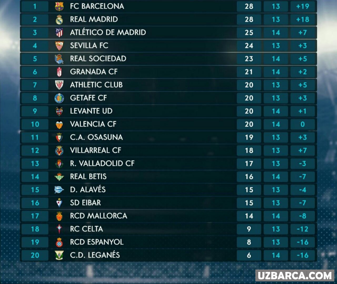 Kechagi o'yinlardan so'ng La Liga turnir jadvalidagi holat