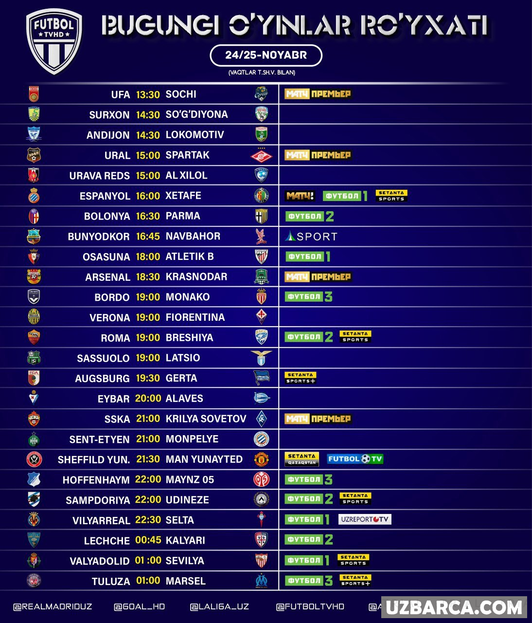 Bugungi uchrashuvlar ro'yxati va ularni translyatsiya qiladigan telekanallar! Barcha o'yinlar Tshv bilan ko'rsatilgan!