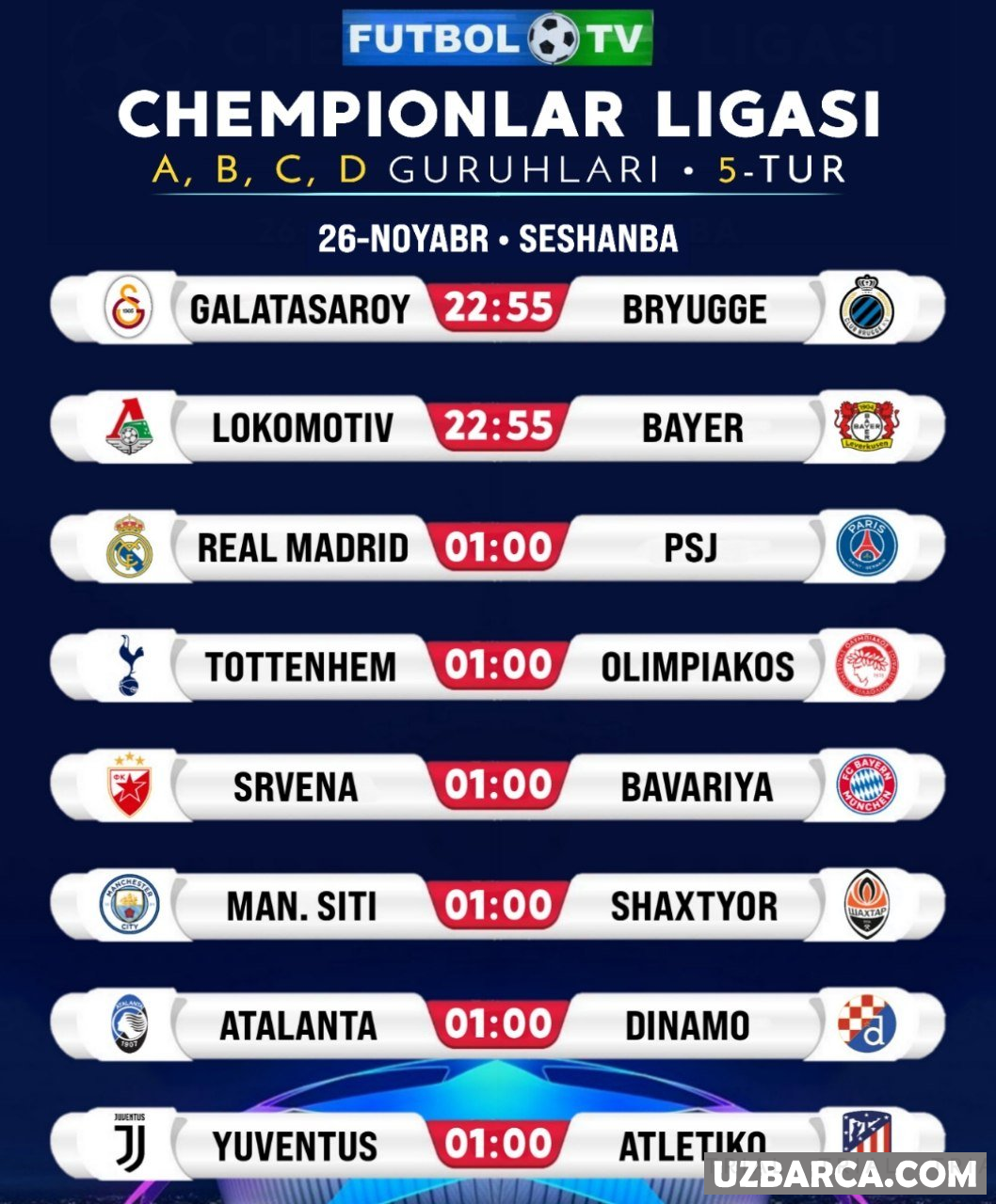 Bu hafta seshanba kuni bo'lib o'tadigan Chempionlar Ligasining 5-tur uchrashuvlar ro'yxati va ularning boshlanish vaqtlari