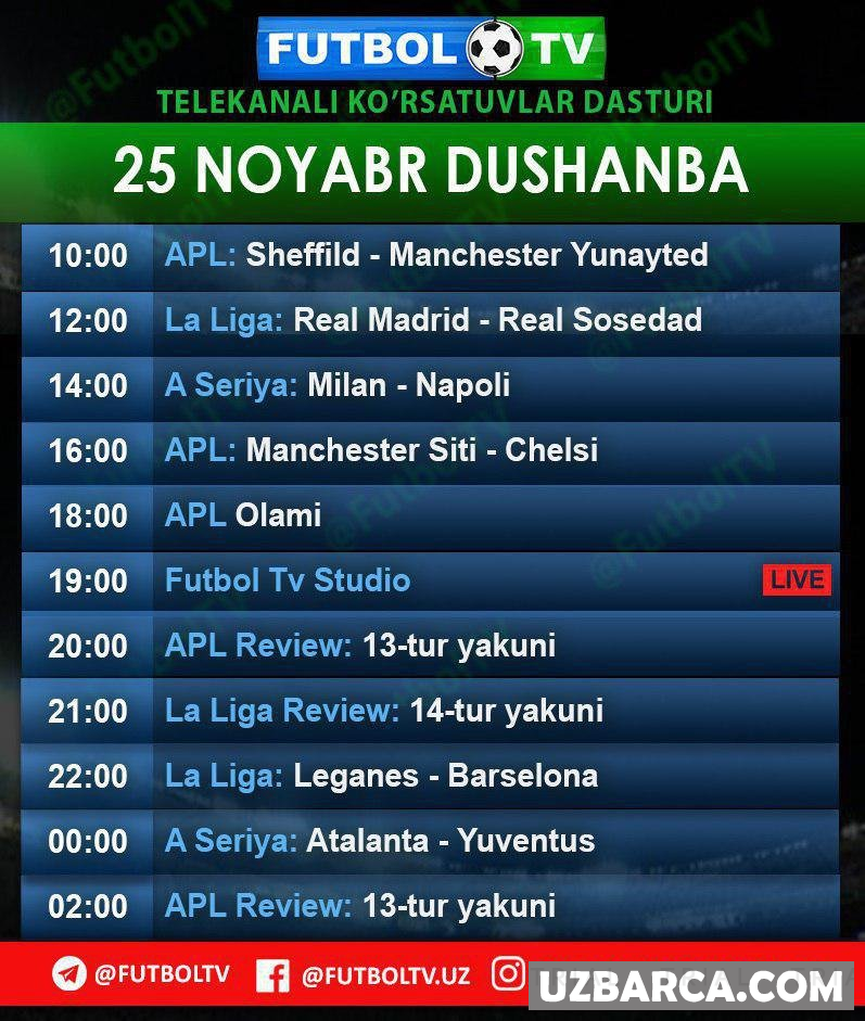 FUTBOL TV telekanalining 25-noyabr kunidagi ko'rsatuvlar dasturi