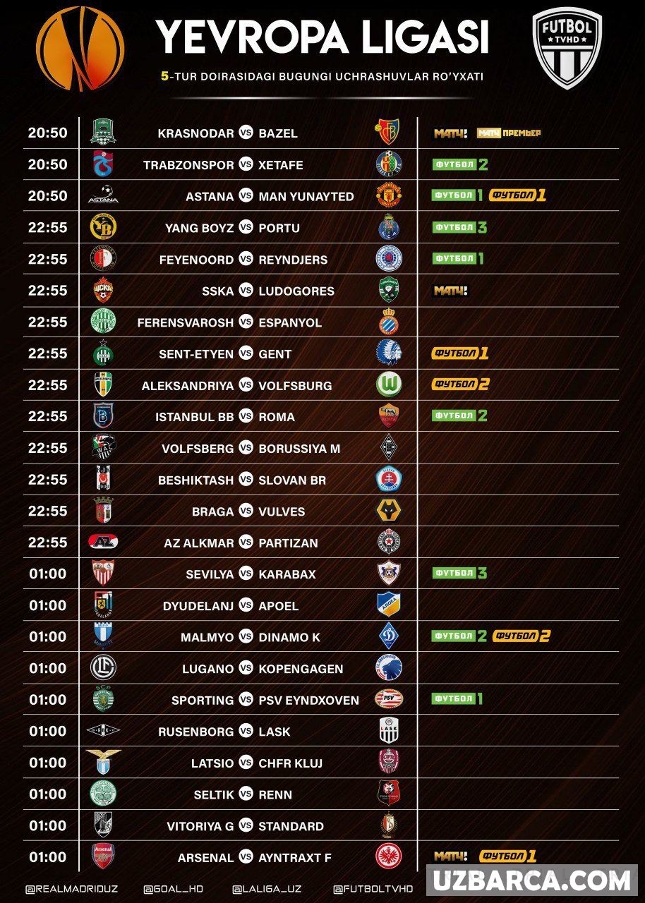 Yevropa Ligasining bugungi uchrashuvlar ro'yxati va ularni translyatsiya qiladigan telekanallar! Barcha o'yinlar (Tshv) bilan ko'rsatilgan!