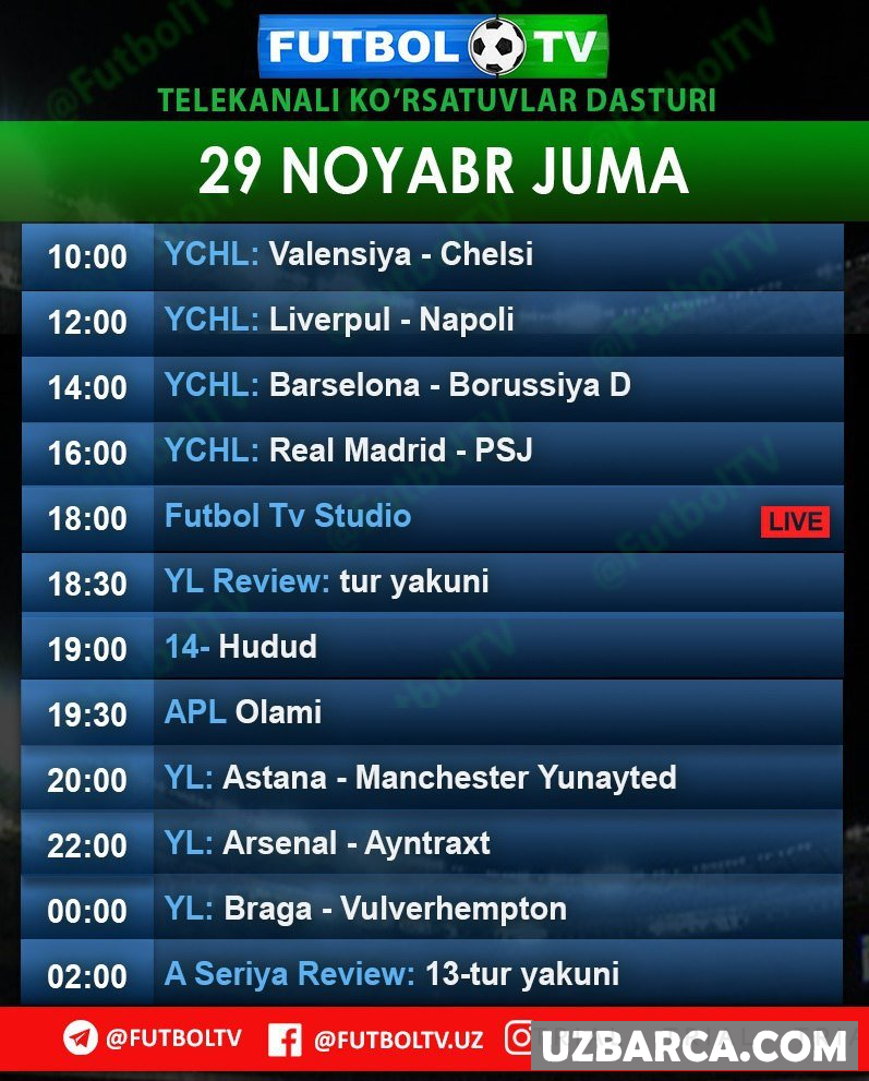 FUTBOL TV telekanalining 29-noyabr kunidagi ko'rsatuvlar dasturi