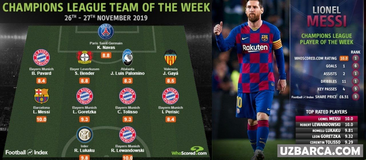 WhoScored talqiniga ko'ra, Messi Chempionlar Ligasida haftaning eng yaxshi o'yinchisi bo'ldi