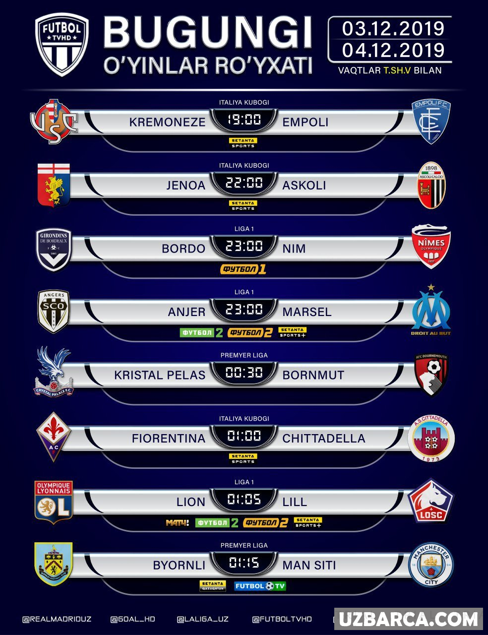 Bugungi uchrashuvlar ro'yxati va ularni translyatsiya qiladigan telekanallar! Barcha o'yinlar Tshv bilan ko'rsatilgan!