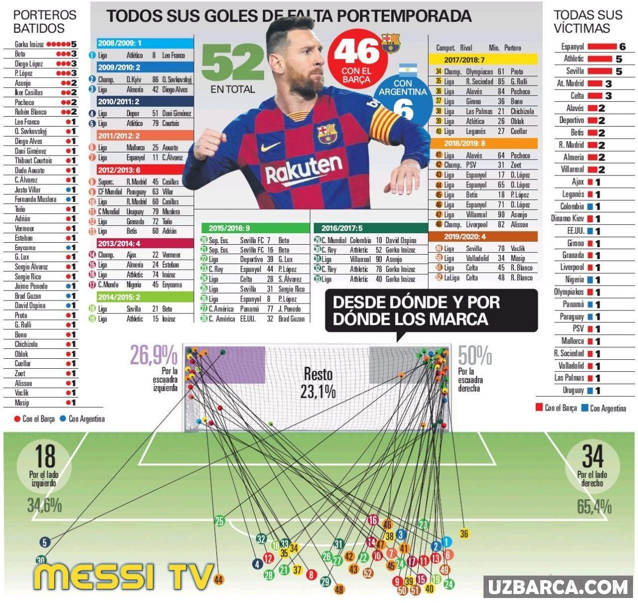 "Leo Messi jarima zarbalaridan ko'proq qaysi klublarga urgan umumiy statistika"