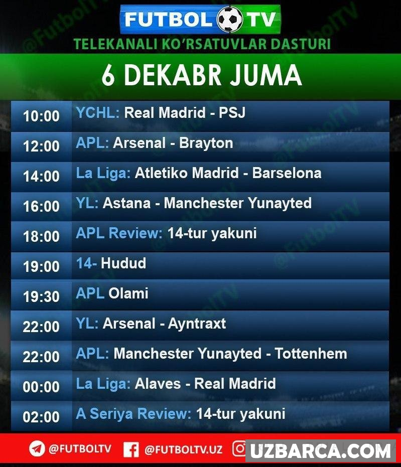 FUTBOL TV telekanalining 6-dekabr kunidagi ko'rsatuvlar dasturi