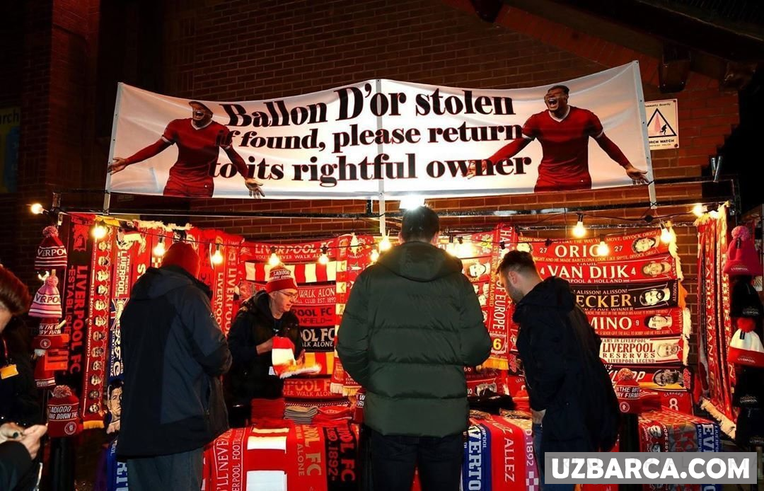 "Liverpool" muxlislari "Oltin to'p" o'g'irlangan, iltimos, uni o'z egasiga qaytaring" degan bannerni osib qo'yishdi.