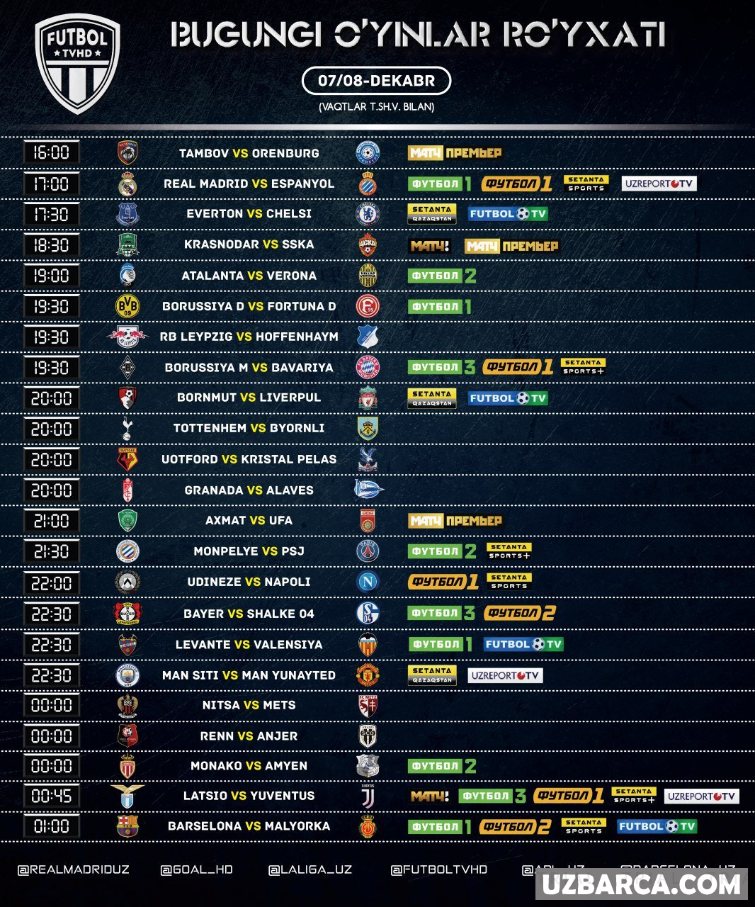 Bugungi uchrashuvlar ro'yxati va ularni translyatsiya qiladigan telekanallar! Barcha o'yinlar Tshv bilan ko'rsatilgan!
