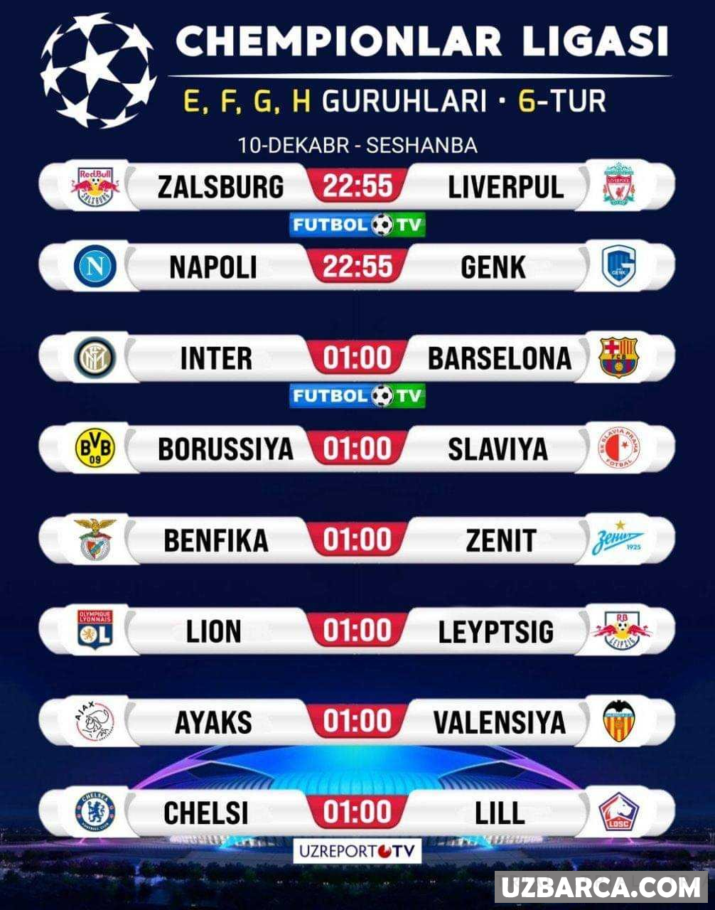 Bugun bo'lib o'tadigan Chempionlar Ligasining 6-tur uchrashuvlar ro'yxati va ularning boshlanish vaqtlari
