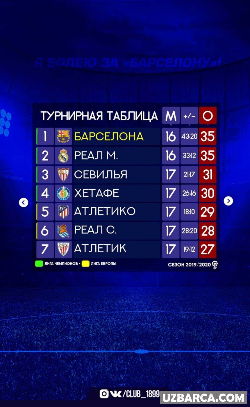 La Liga. Kuchli 7 likning turnir jadvalidagi xolati bilan tanishing