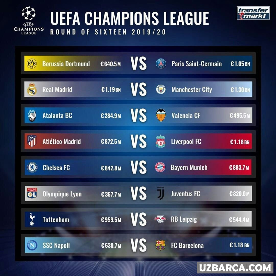 Chempionlar ligasi 1/8 finalning juftliklarning futbolchilarning umumiy narxi