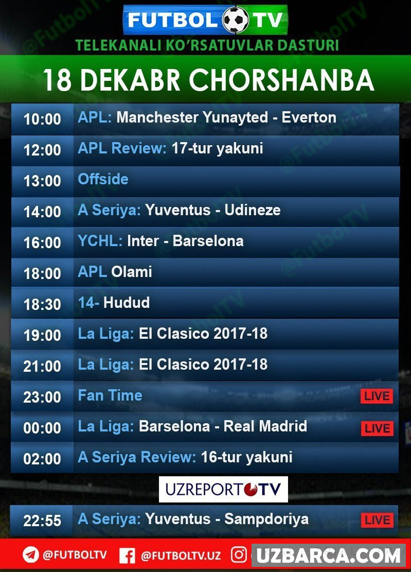 FUTBOL TV telekanalining 18-dekabr kunidagi ko'rsatuvlar dasturi