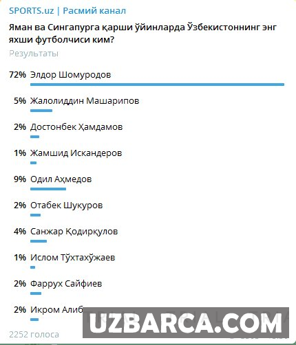 Eng ko‘p ovoz katta ustunlik bilan Eldor Shomurodovga berildi – 72. Ikkinchi o‘rinda Odil Ahmedov qayd etildi – 9. Kuchli uchlikni Jaloliddin Masharipov yakunladi – 5.