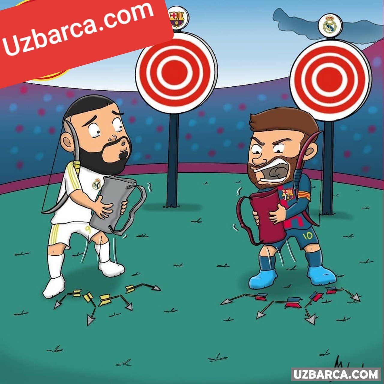 Karikatura. Kechagi "El Klassiko"da Messi va Benzemaning o'qilari nishonga aniq bormadi.