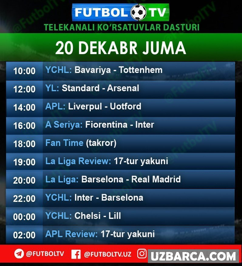 FUTBOL TV telekanalining 20-dekabr kunidagi ko'rsatuvlar dasturi