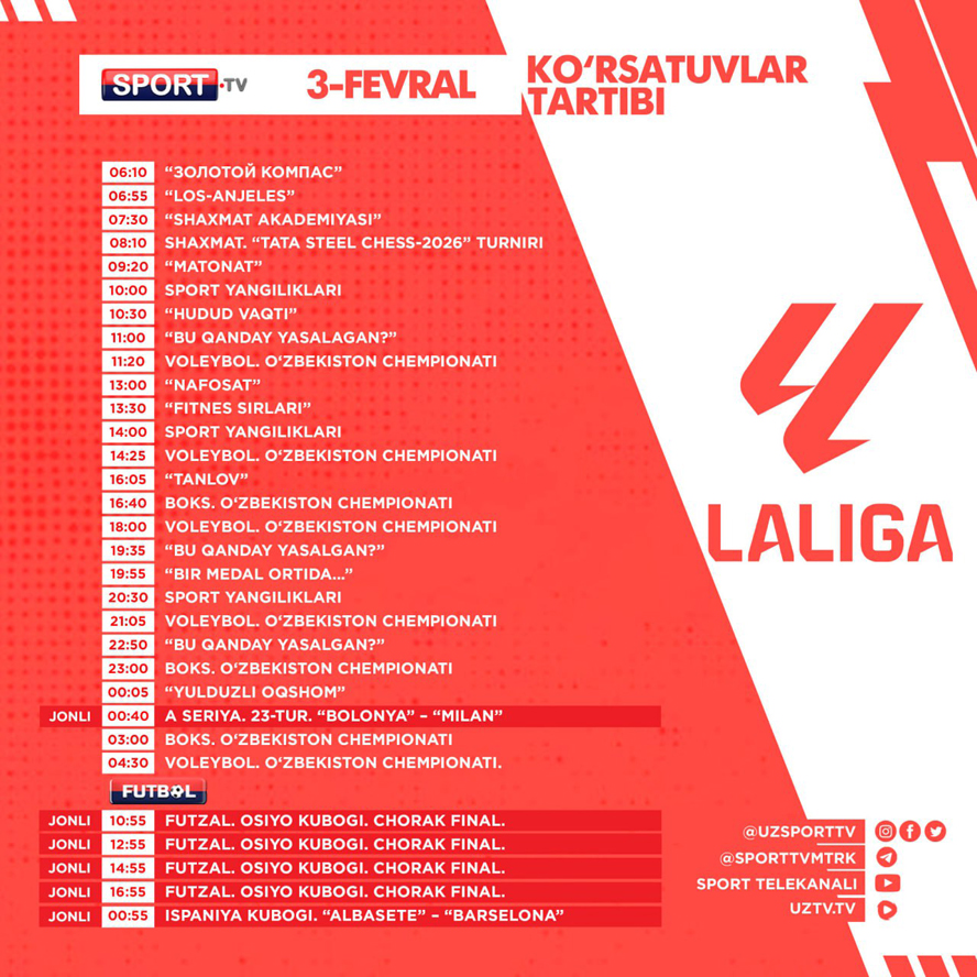 Sport va Futbol telekanallarida 3-fevral kuni 2 ta futbol va futzal bo'yicha Osiyo kubogidan translyatsiyalar bor