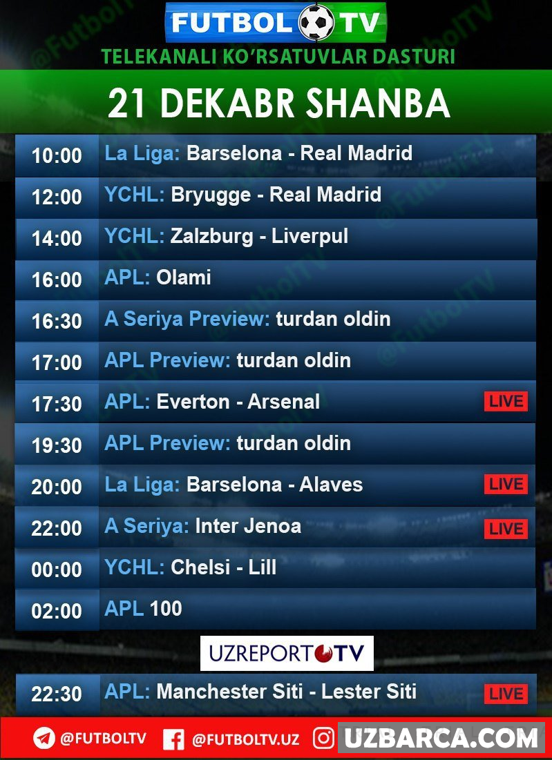 FUTBOL TV telekanalining 21-dekabr kunidagi ko'rsatuvlar dasturi