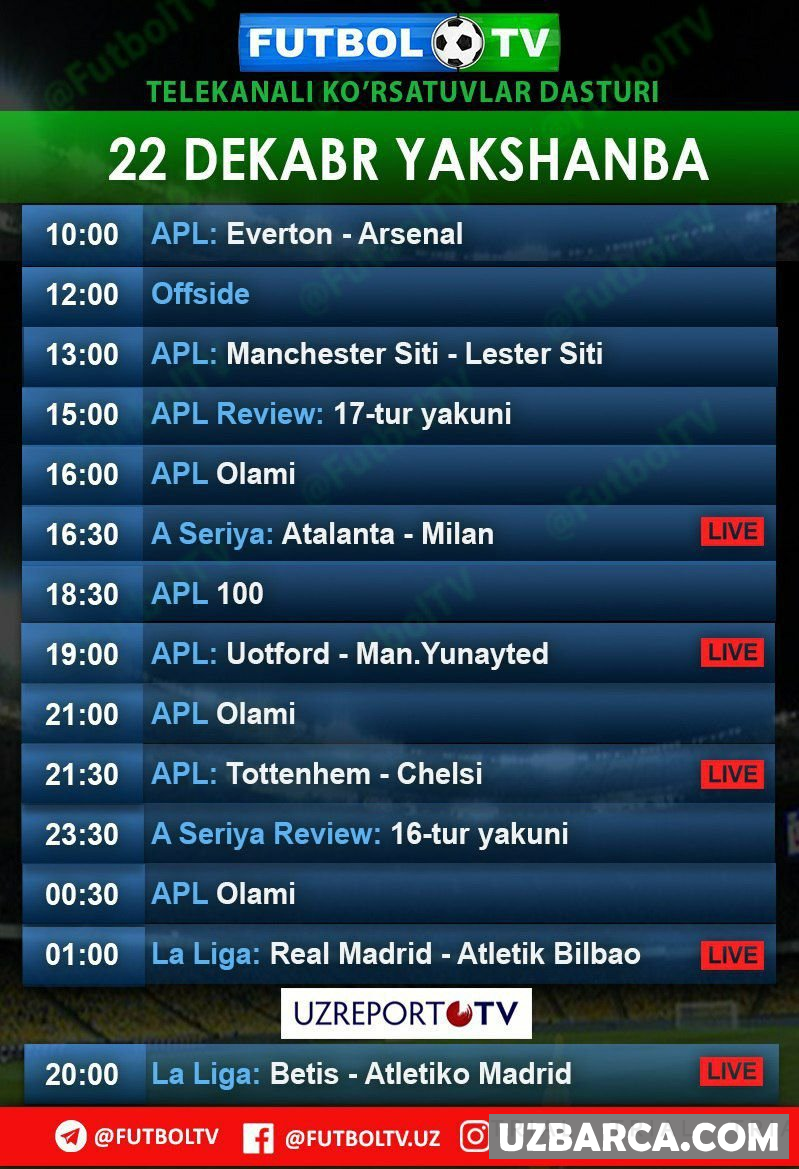 FUTBOL TV telekanalining 22-dekabr kunidagi ko'rsatuvlar dasturi