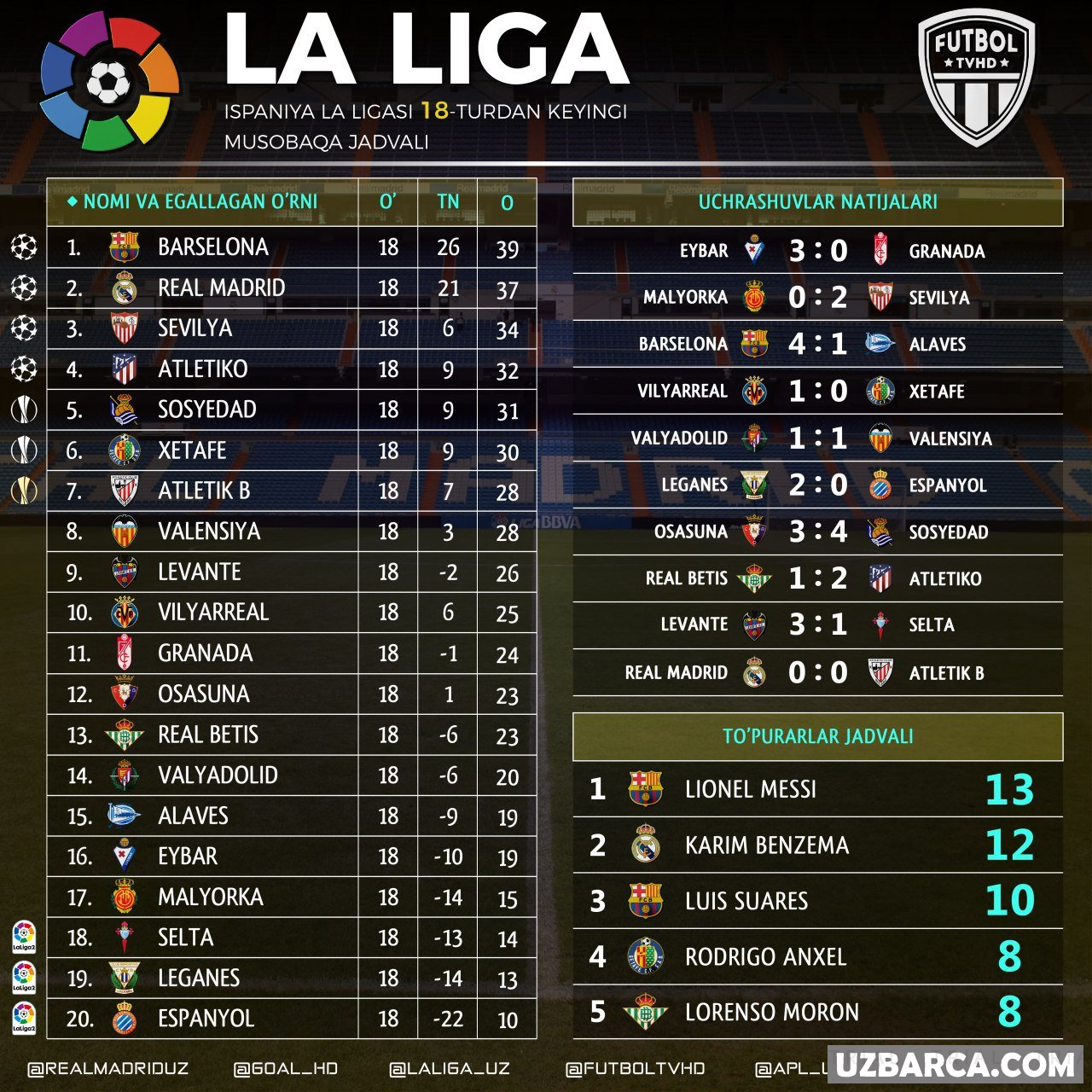 Ispaniya La Ligasining 18-tur o'yinlari natijasi, turnir jadvalidagi holat va to'purarlar ro'yxati