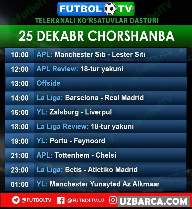 FUTBOL TV telekanalining 25-dekabr kunidagi ko'rsatuvlar dasturi